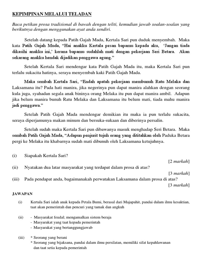 Contact kepimpinan melalui teladan on messenger. Bm spm kepımpınan melaluı teladan。 prosa tradisional: Maksud kepimpinan dan perkataannya dalam bahasa inggeris. Prosa tradisional (kepimpinan melalui teladan) sinopsis kisah bermula apabila seri betara majapahit berbincang dengan patih gajah mada untuk menewaskan melaka setelah kematian penjurit tujuh bersaudara. Ada juga perkataan sinonim dan berkaitan dengannya ada dipaparkan di sini.
